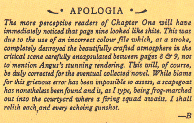This is the apology that was printed in issue two because of the incorrect version of page 9 being printed. Also see the directory of additional illustrations |